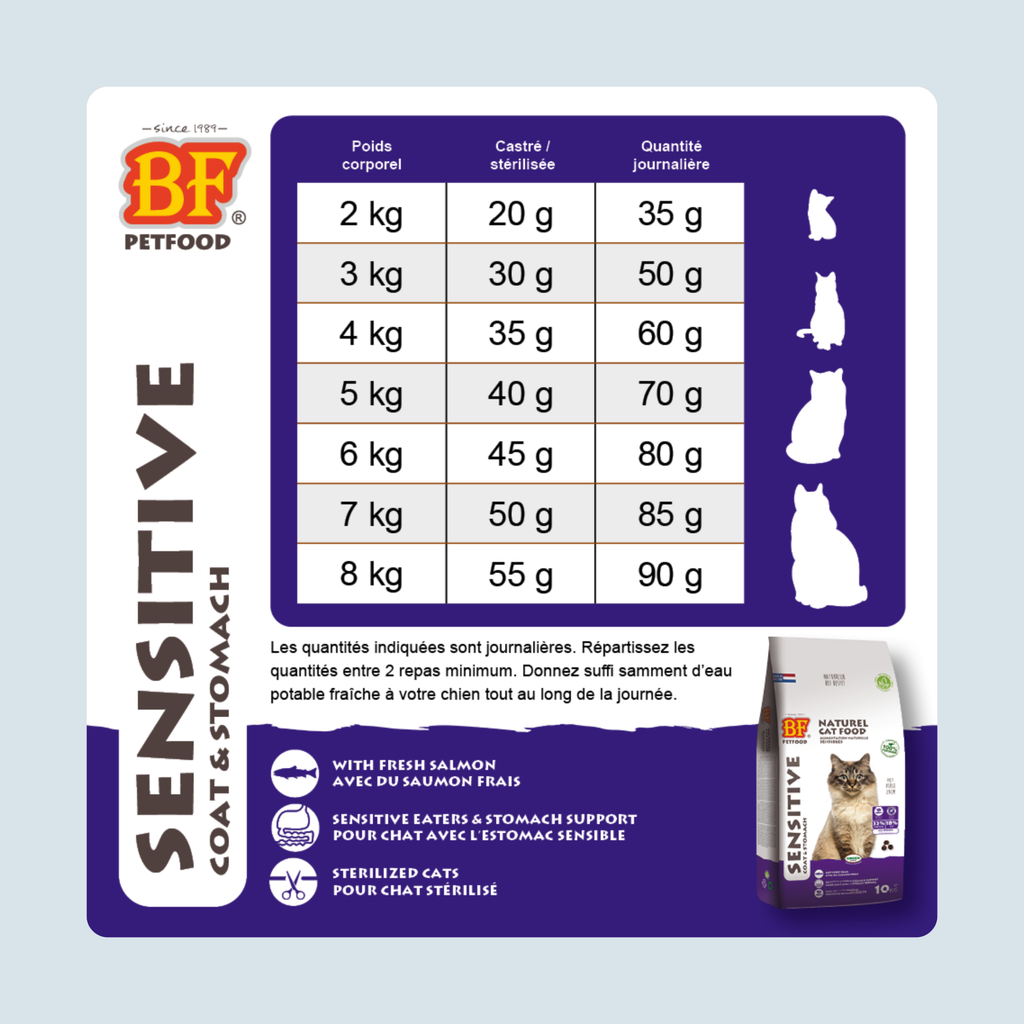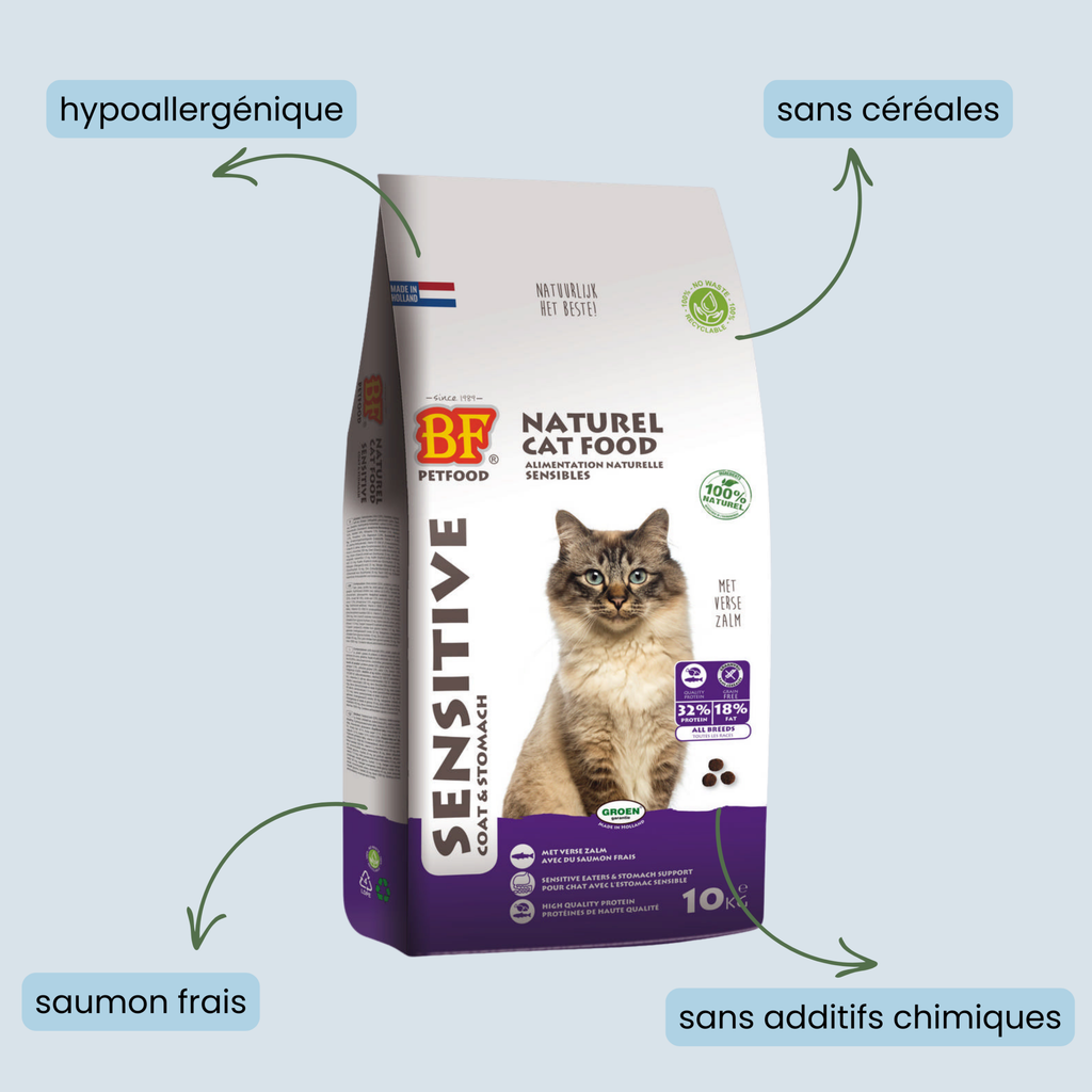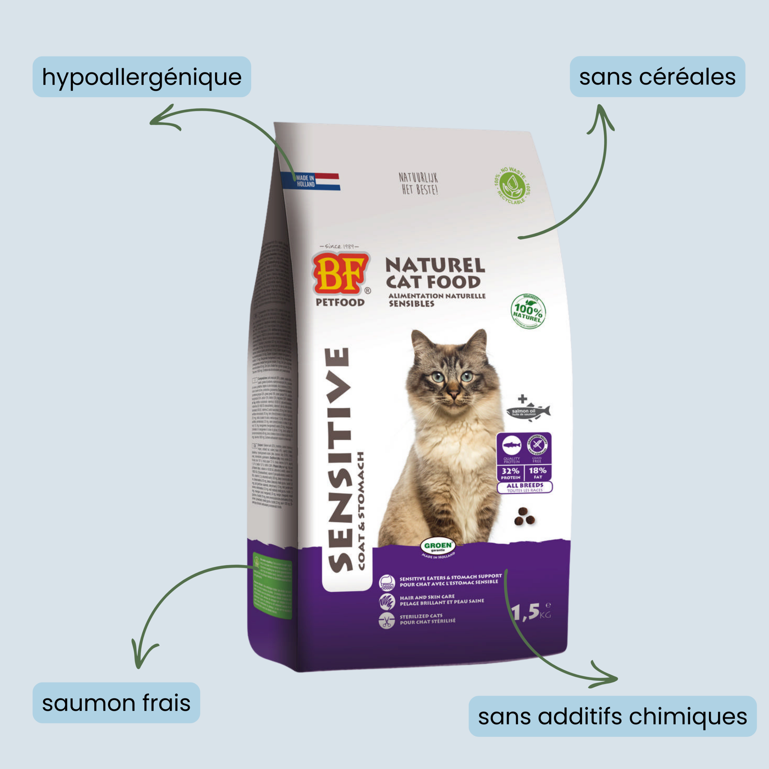 El alimento para gatos sensibles está especialmente formulado para favorecer la digestión de gatos con problemas digestivos. Contiene ingredientes de fácil digestión, seleccionados para minimizar el riesgo de intolerancias o alergias, contribuyendo así a una digestión saludable. Con una dieta adecuada, como este alimento antialérgico , tu felino recuperará su vitalidad. ¡Y sus pequeños problemas digestivos serán cosa del pasado!