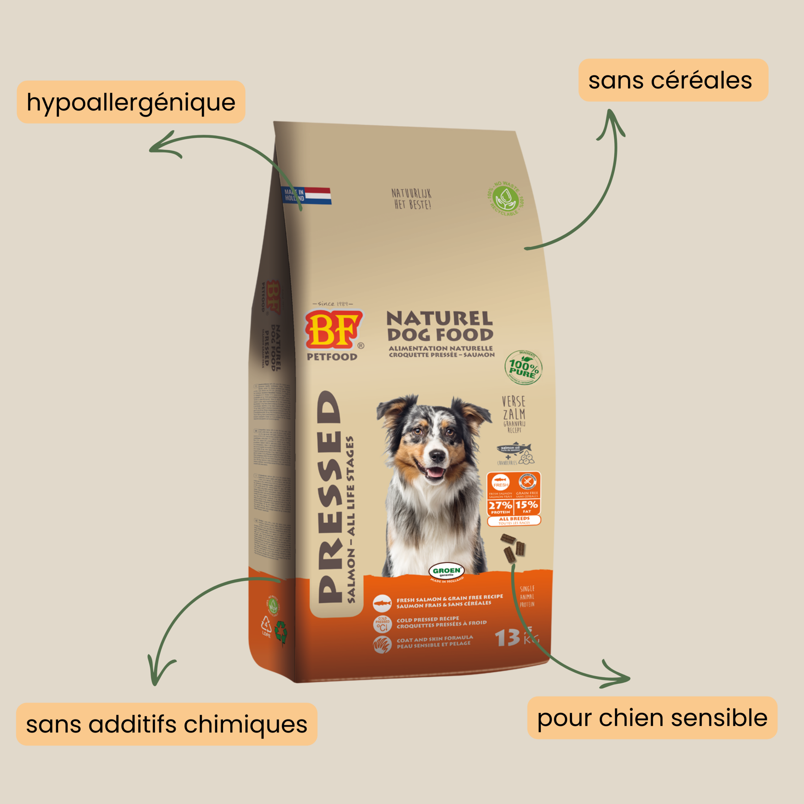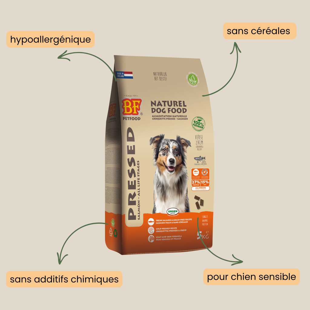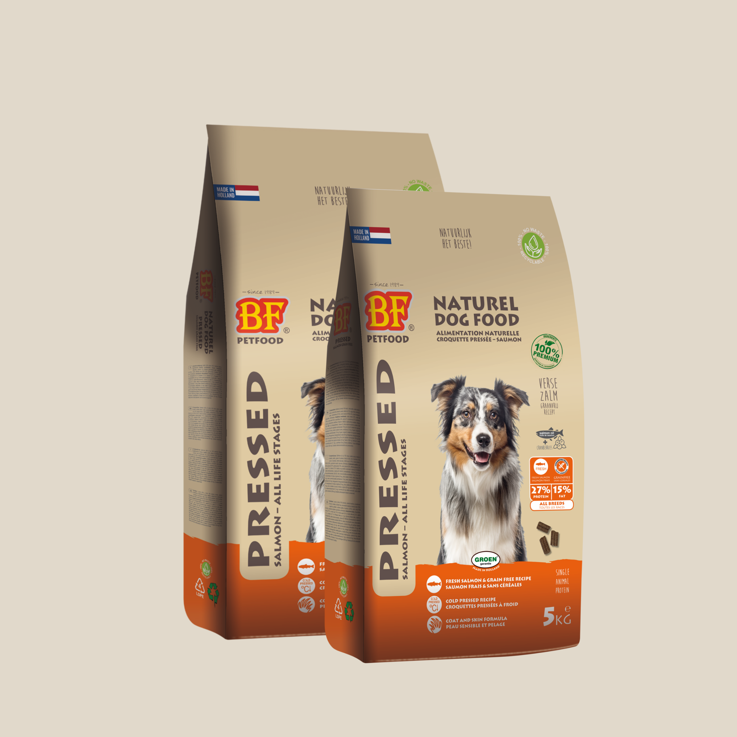 Desde el punto de vista digestivo, el salmón también ofrece numerosas ventajas. Es una proteína altamente digestible y con bajo contenido de alérgenos , lo que la convierte en una fuente proteica ideal para perros con problemas digestivos recurrentes. Si bien el uso de salmón aumenta la digestibilidad de las croquetas, el proceso de preparación también juega un papel crucial. Las croquetas de salmón de BF Petfood son prensadas en frío y no contienen cereales . Este proceso artesanal da como resultado un alimento para perros cocinado a baja temperatura , a diferencia de las croquetas extruidas tradicionales, que se preparan a altas temperaturas. Las croquetas prensadas a base de salmón son aptas para perros de todas las edades y razas.