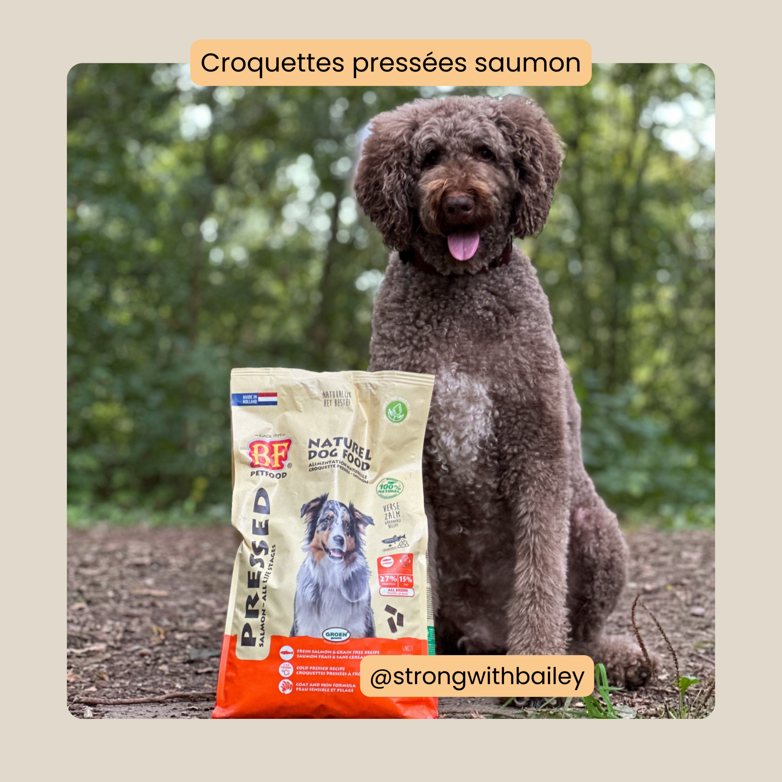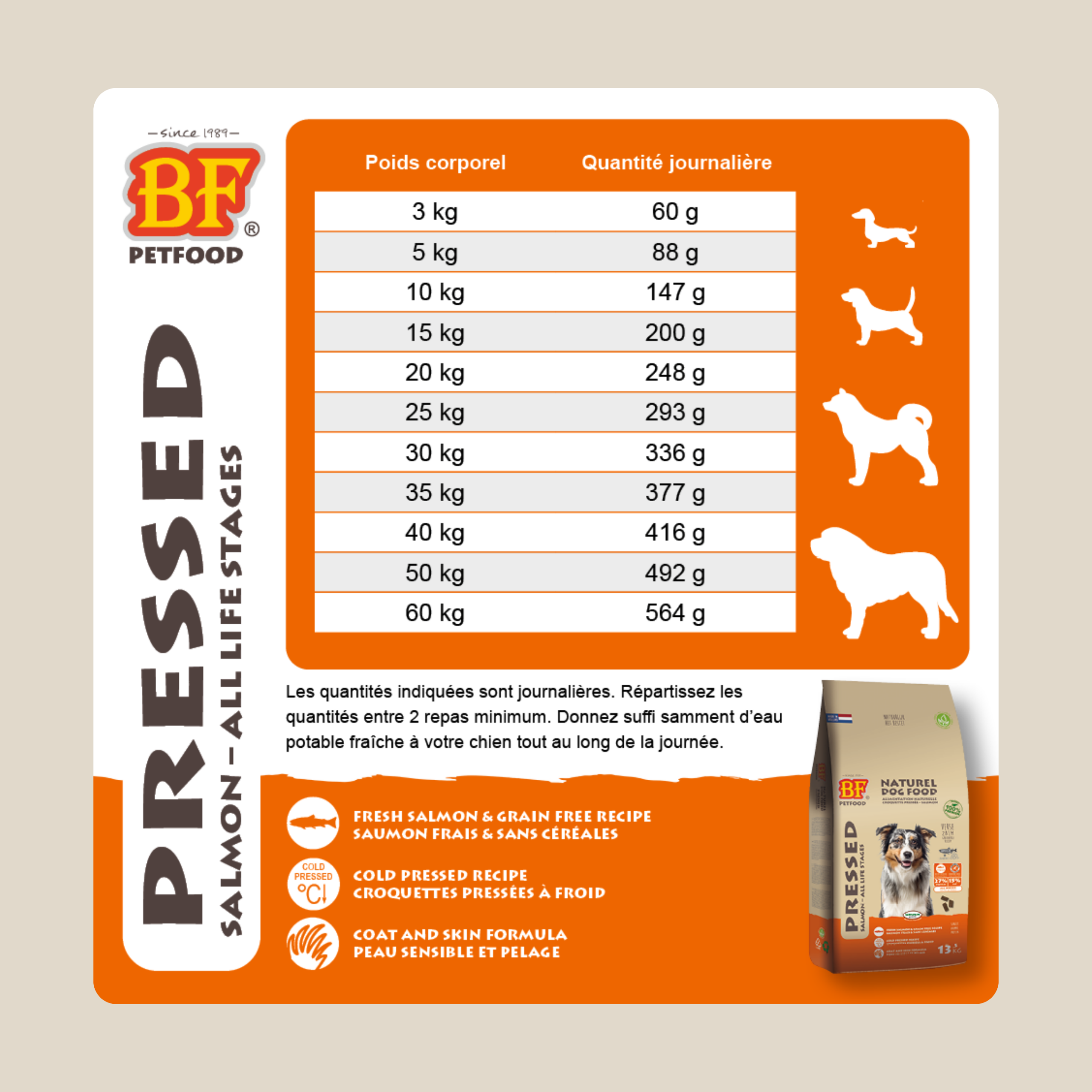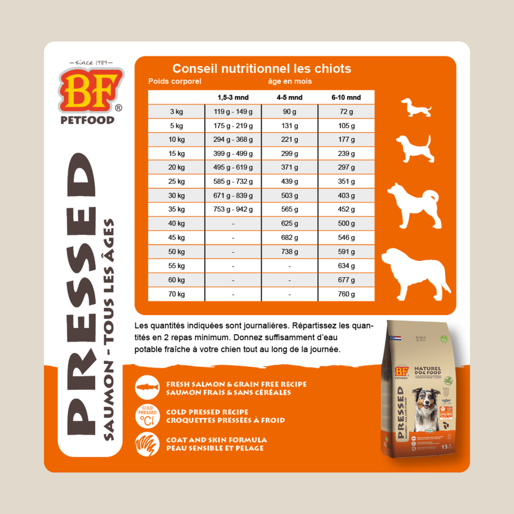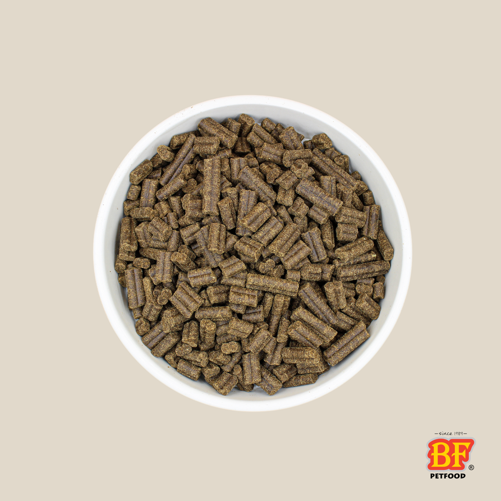 Desde el punto de vista digestivo, el salmón también ofrece numerosas ventajas. Es una proteína altamente digestible y con bajo contenido de alérgenos , lo que la convierte en una fuente proteica ideal para perros con problemas digestivos recurrentes. Si bien el uso de salmón aumenta la digestibilidad de las croquetas, el proceso de preparación también juega un papel crucial. Las croquetas de salmón de BF Petfood son prensadas en frío y no contienen cereales . Este proceso artesanal da como resultado un alimento para perros cocinado a baja temperatura , a diferencia de las croquetas extruidas tradicionales, que se preparan a altas temperaturas. Las croquetas prensadas a base de salmón son aptas para perros de todas las edades y razas.