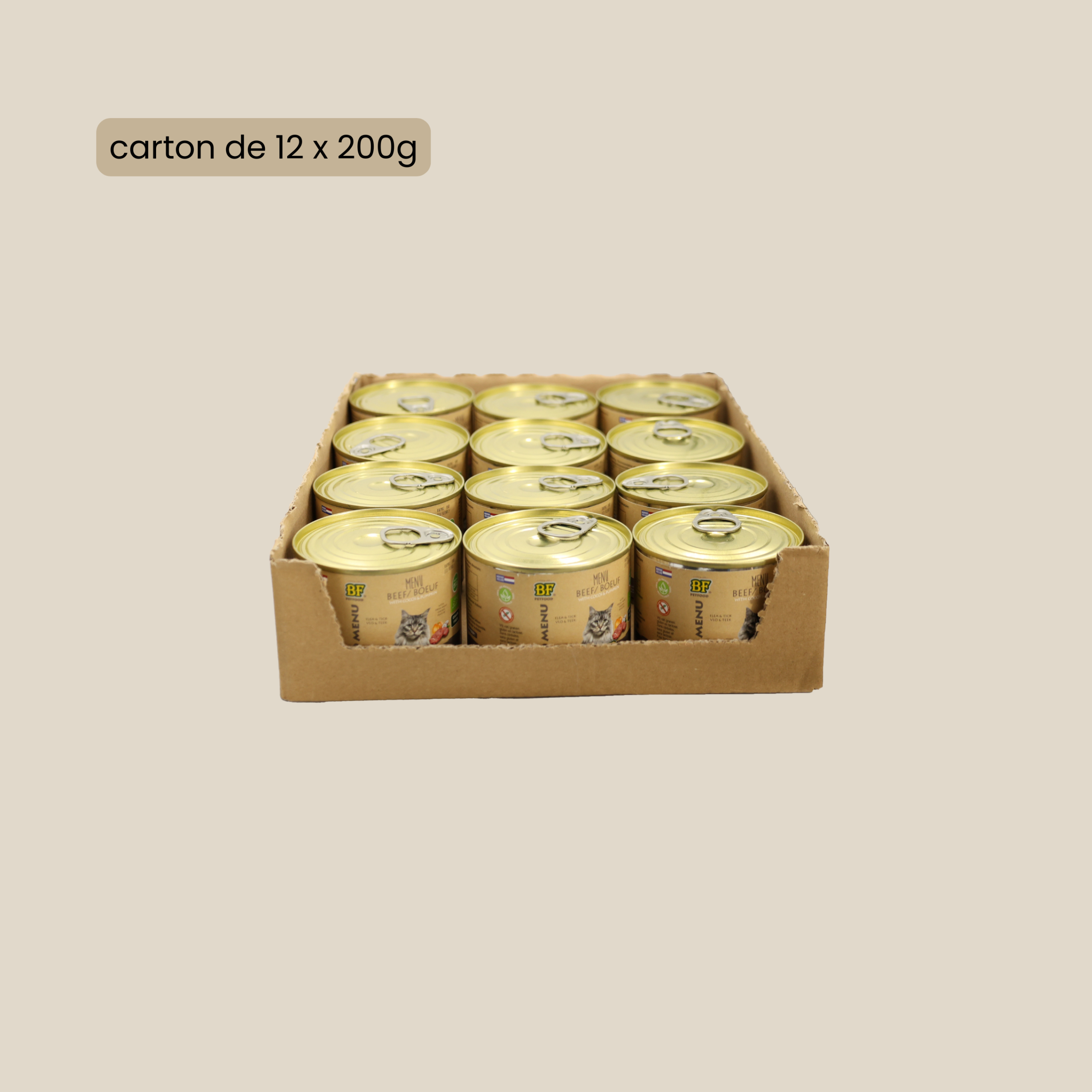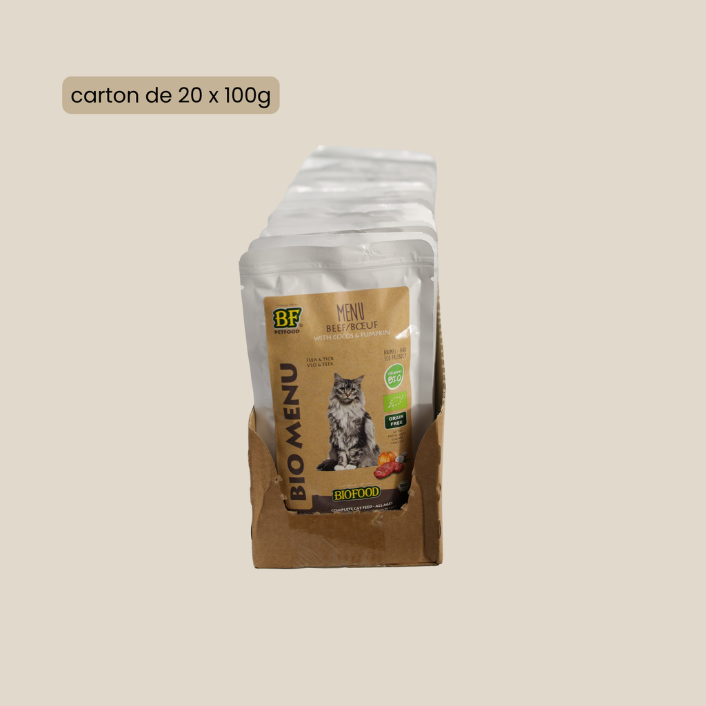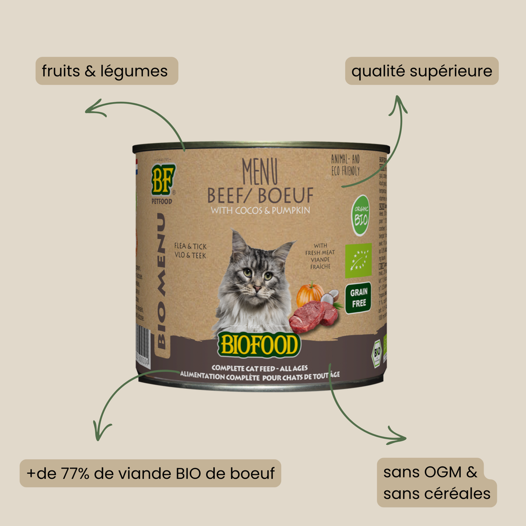 El alimento húmedo de res de BF Petfood para gatos esterilizados y no esterilizados se distingue de otros alimentos húmedos por su sabor inigualable, su excepcional calidad nutricional y su certificación orgánica. ¡Dale a tu gato lo mejor de la naturaleza con nuestro Menú de Res Orgánica!