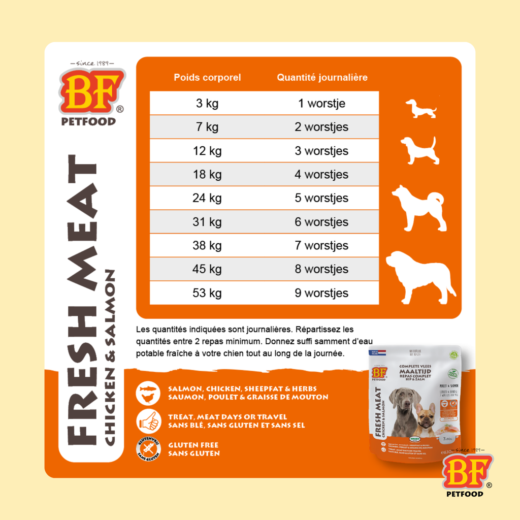 Loin de l’alimentation industrielle, BF Petfood vous garantit une alimentation pour chien saine et équilibrée, contenant exclusivement des ingrédients d’origine naturelle. Ces délicieuses saucisses sont parfaitement adaptées à tous les chiens, même les plus grandes races.