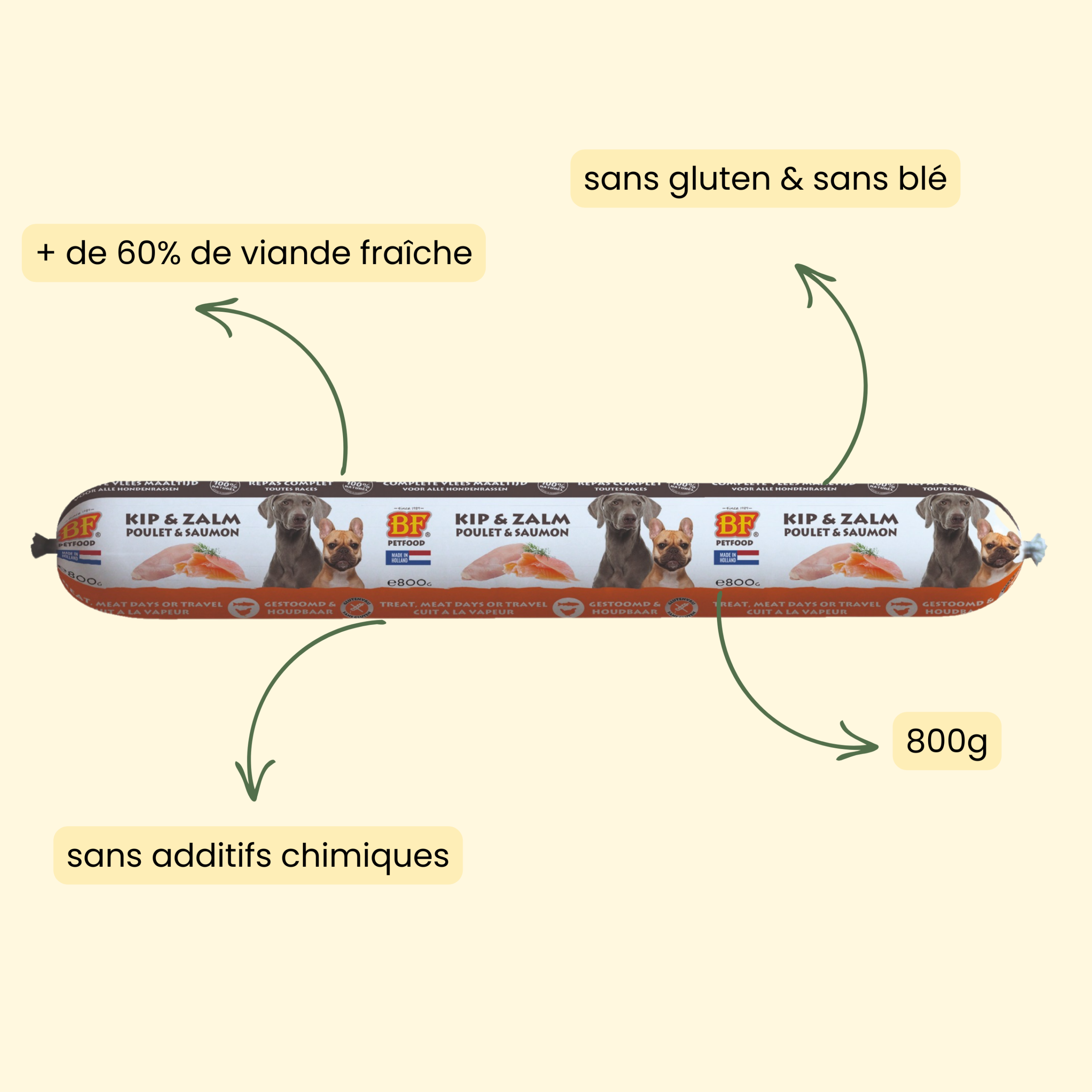 TOUS les chiens l'adorent ! C’est un peu le “graal” de l’aliment complet, qui se décline également au canard ou à l’agneau. Ce saucisson au poulet et saumon cuit à la vapeur est à base de viandes fraîches, d’abats, de riz, de graisse de mouton, d’herbes naturelles et rien d’autre. Un délicieux repas pour chien au saumon qui offrira à votre toutou tous les nutriments dont il a besoin au quotidien.