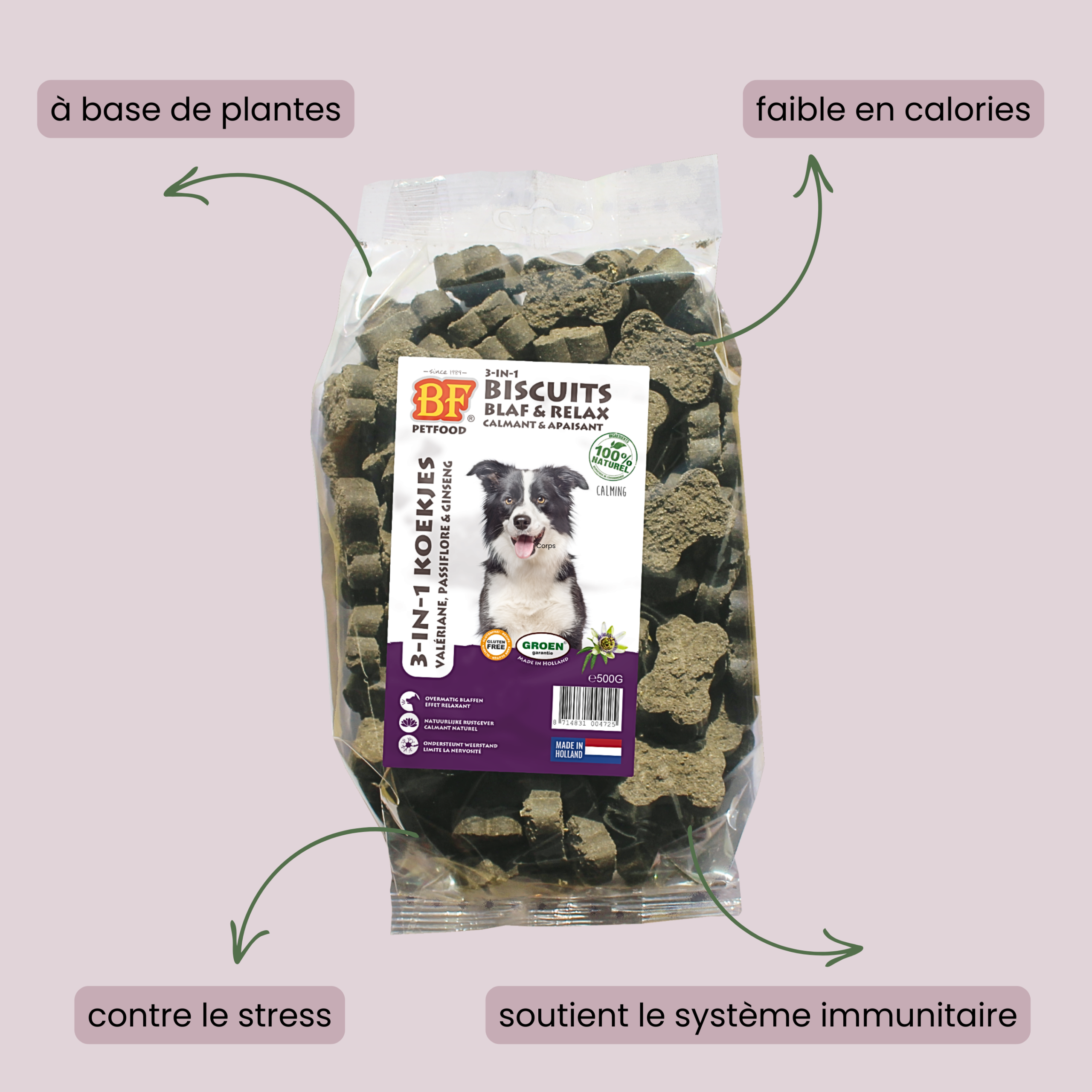 Le biscuit Relax BF Petfood est un biscuit pour chien riche en plantes connues pour leurs propriétés déstressantes et apaisantes.