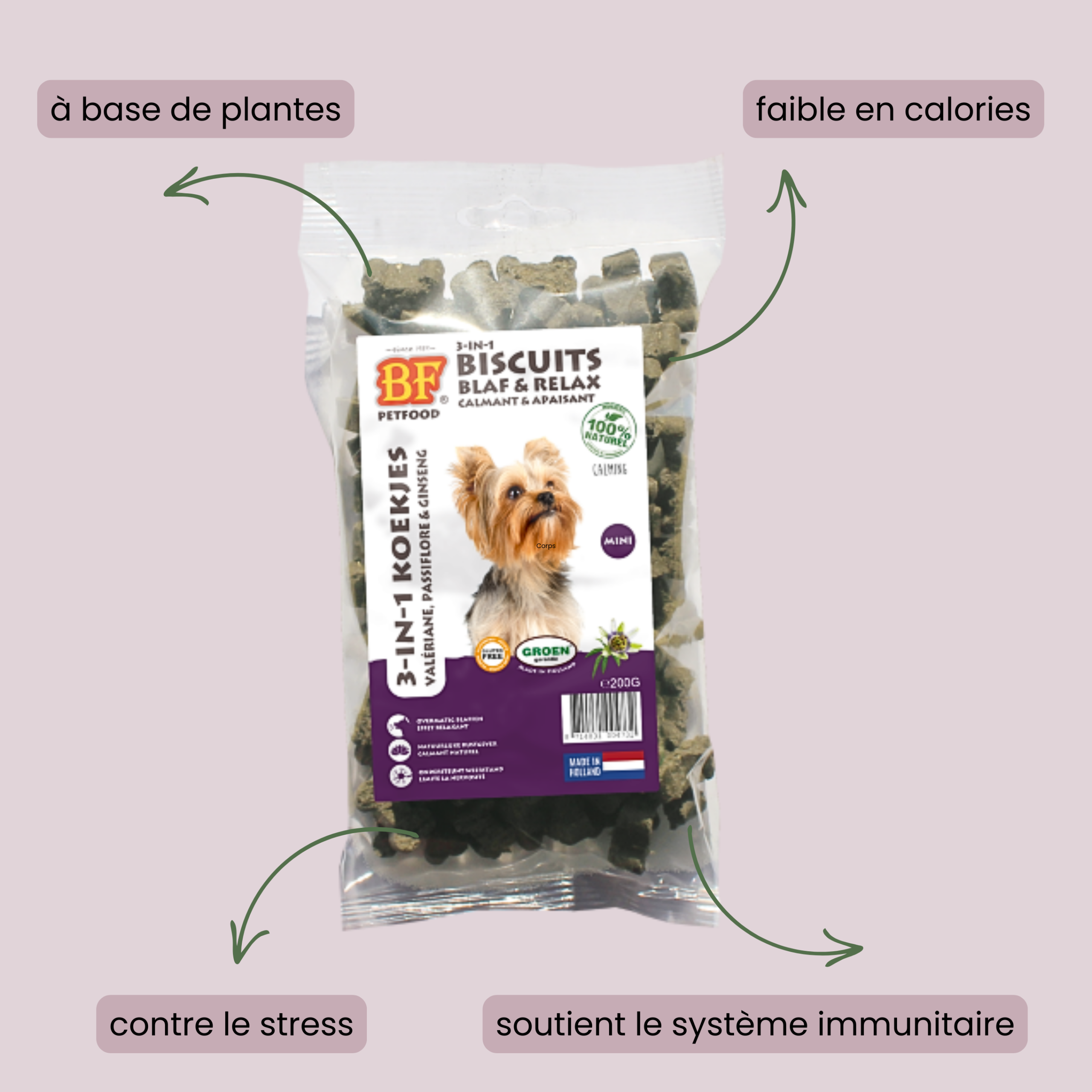 Le biscuit Relax de BF Petfood est bien plus qu’une simple friandise pour chien; il répond à un besoin spécifique en agissant comme un calmant d’origine naturelle pour les chiens souffrant de stress ou d'anxiété. Voici pourquoi ce biscuit se démarque comme le choix idéal pour les chiens stressés :