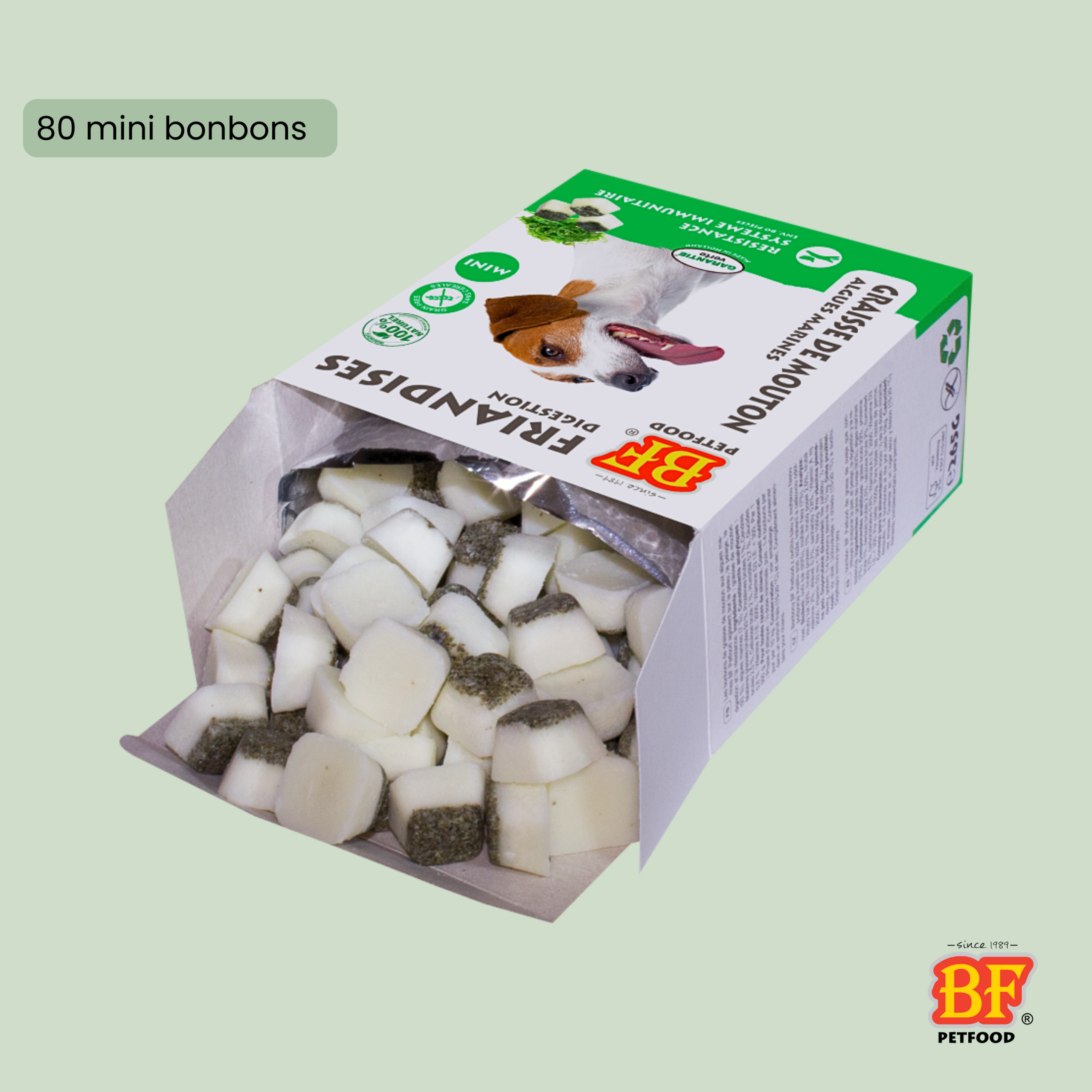 La graisse de mouton, constituant principal de ces bonbons, apporte une douceur et un fondant qui enchanteront votre chien, tandis que les algues marines apportent une touche marine subtile et rafraîchissante. Mais au-delà de leur goût irrésistible, c'est leur effet sur la digestion qui fait de ces bonbons de véritables alliés pour la santé de votre boule de poils.