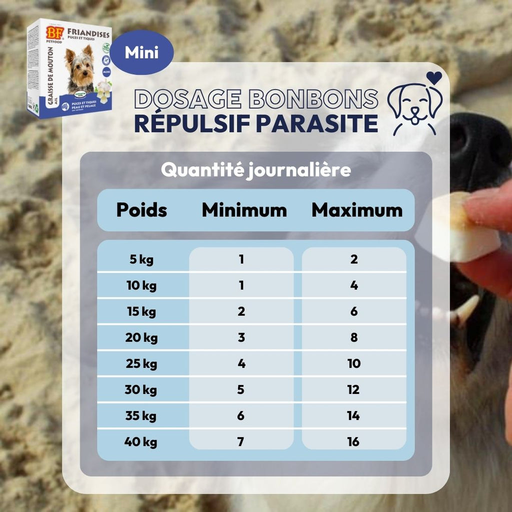 Simplifiez la protection de votre fidèle compagnon contre les parasites grâce à nos bonbons savoureux, élaborés à partir d’ingrédients d’origine naturelle. Chez BF Petfood, nous privilégions des solutions naturelles pour la santé de votre animal et la préservation de l’environnement. Contrairement aux antiparasitaires chimiques, nos bonbons n’ont aucun impact toxique sur les écosystèmes aquatiques ni sur la peau ou le système nerveux de votre chien. Protégez votre compagnon de manière simple, responsable et respectueuse de la planète.
