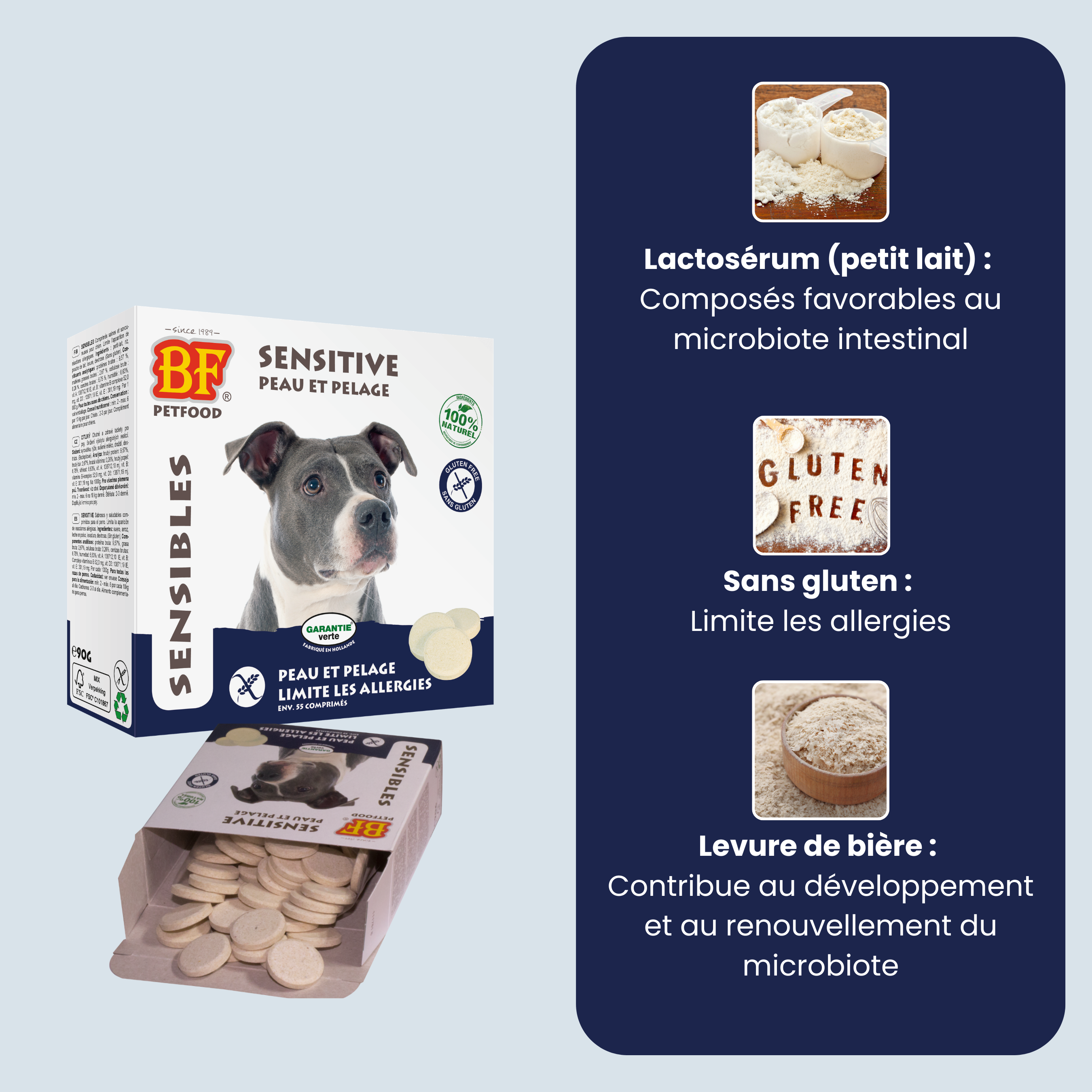 Votre toutou a le poil sec, terne ou cassant ? Pour l’aider à retrouver une fourrure brillante et soyeuse, les comprimés Sensitive vont apporter un supplément de vitamines et minéraux bénéfiques pour la peau.