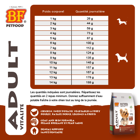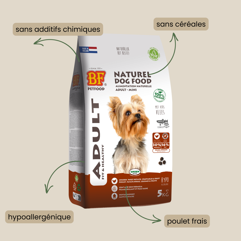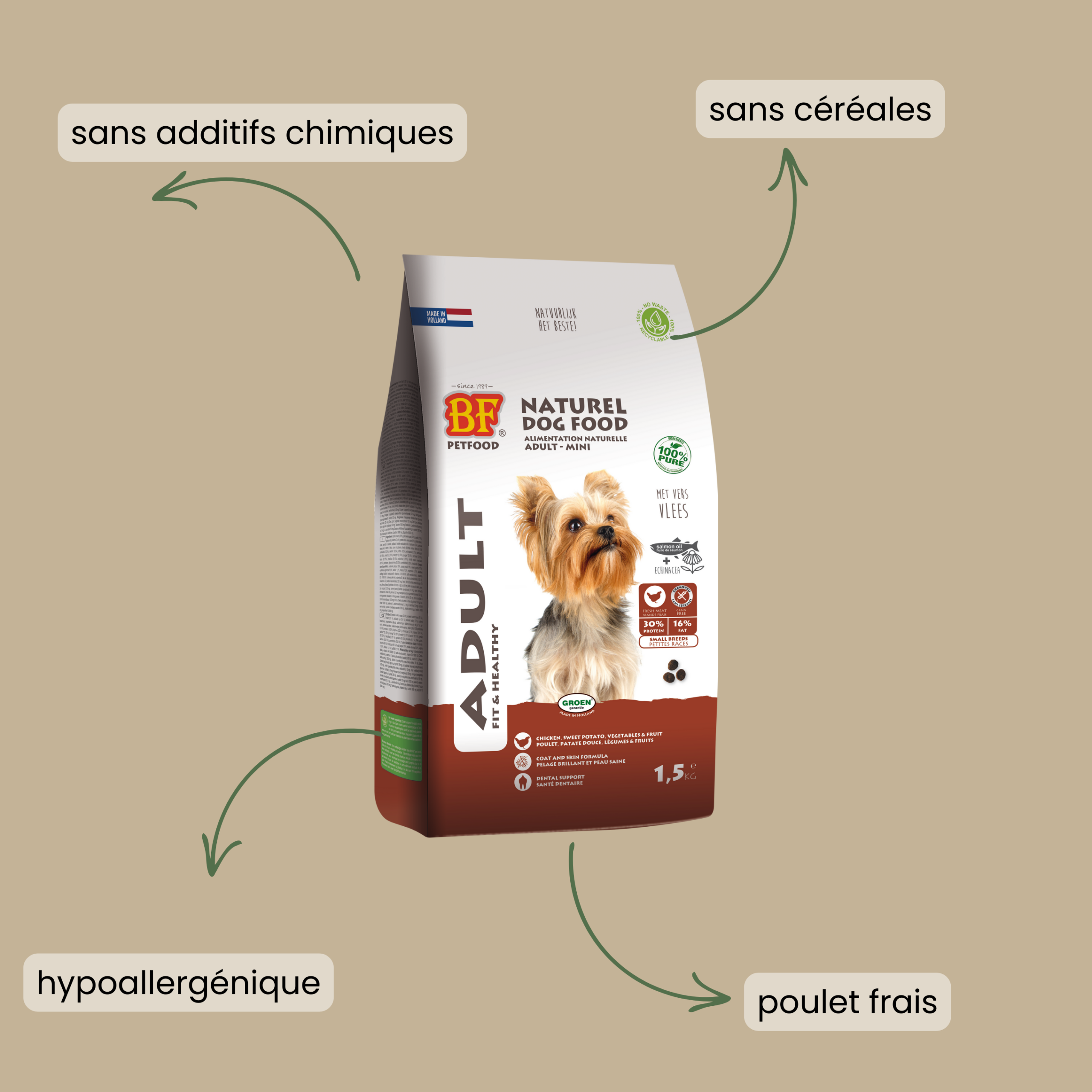 Les croquettes BF®Petfood Mini Adult ont été spécialement conçues pour répondre aux besoins spécifiques de votre petit chien. Elles sont élaborées sans céréales, un choix stratégique pour faciliter la digestion et optimiser l'absorption des nutriments.