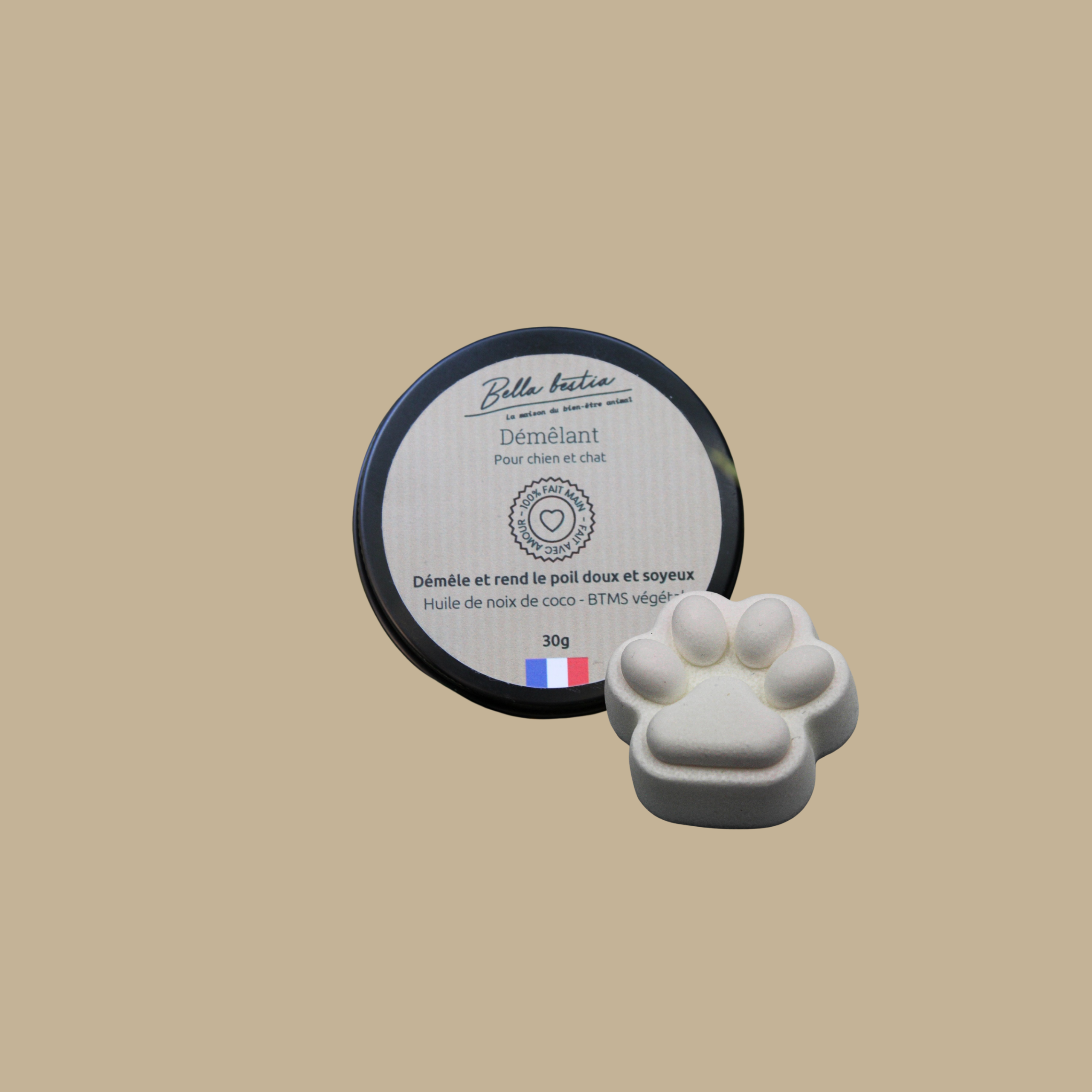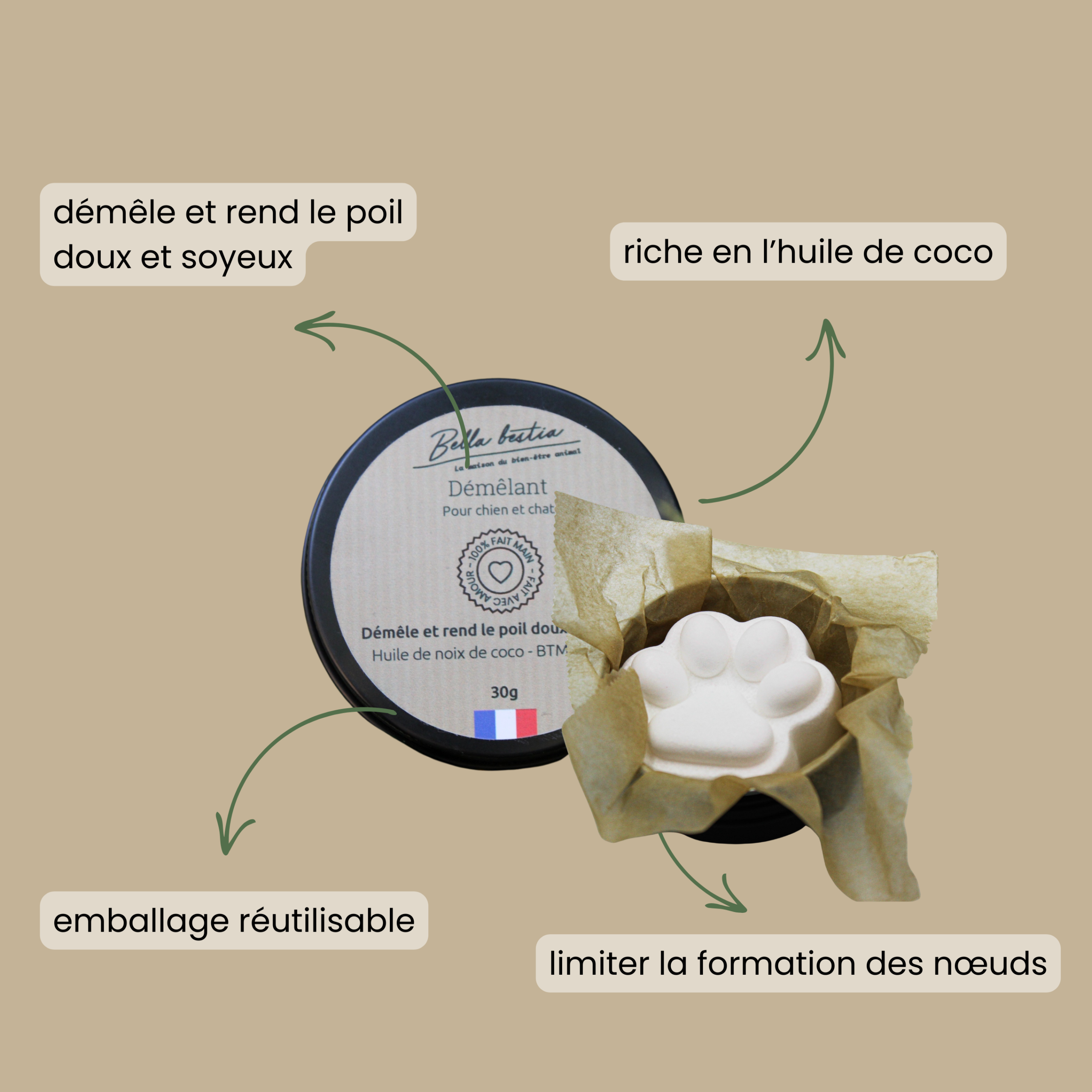 Le démêlant, qu'il soit naturel ou professionnel, a pour principal objectif de démêler les nœuds, rendre le poil plus doux et facile à brosser.