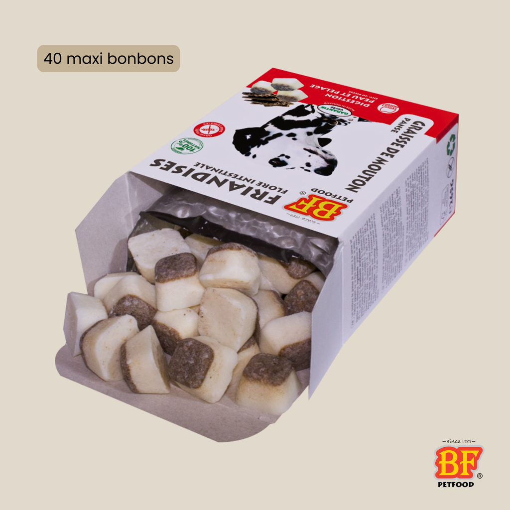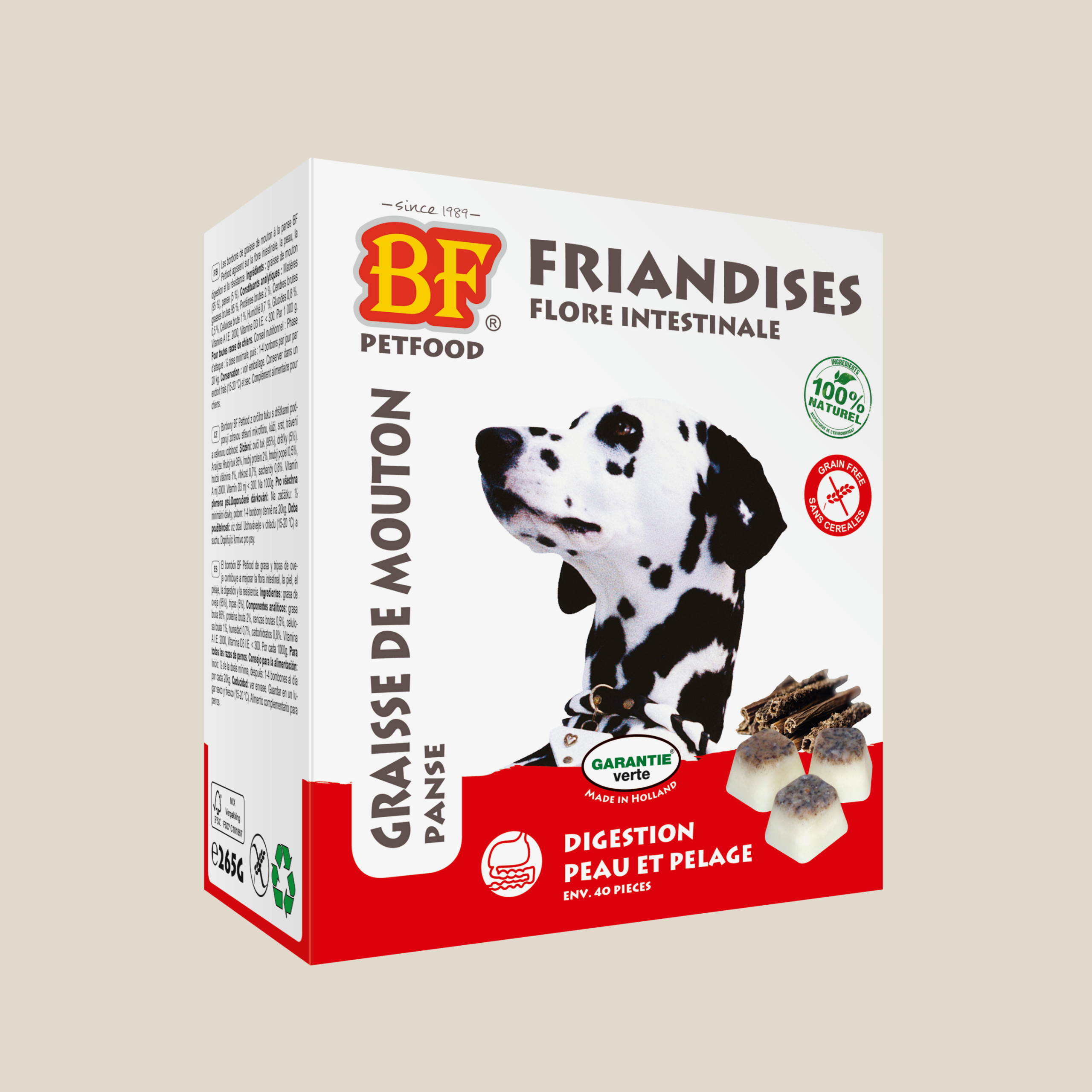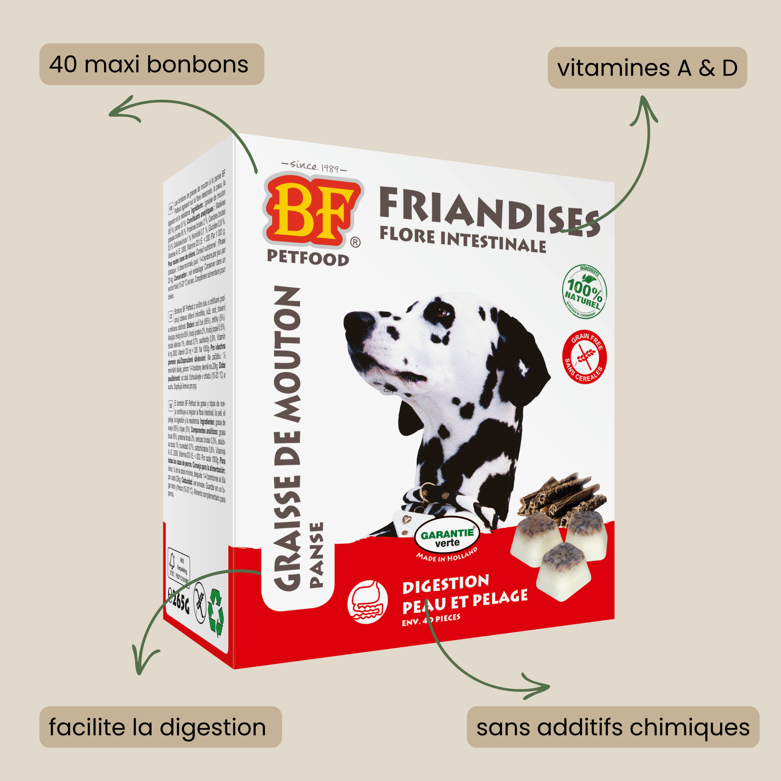 Les Bonbons à la Panse de BF®Petfood, composés de graisse de mouton nourrissante, offrent une multitude d'avantages qui contribuent au bien-être global de votre chien. Enrichies en bactéries essentielles et en enzymes, ces bonbons permettent de prendre soin de la flore intestinale de votre chien, permettant ainsi d'améliorer l'absorption des nutriments et l’élimination efficace des déchets, pour un bon fonctionnement de son système digestif.