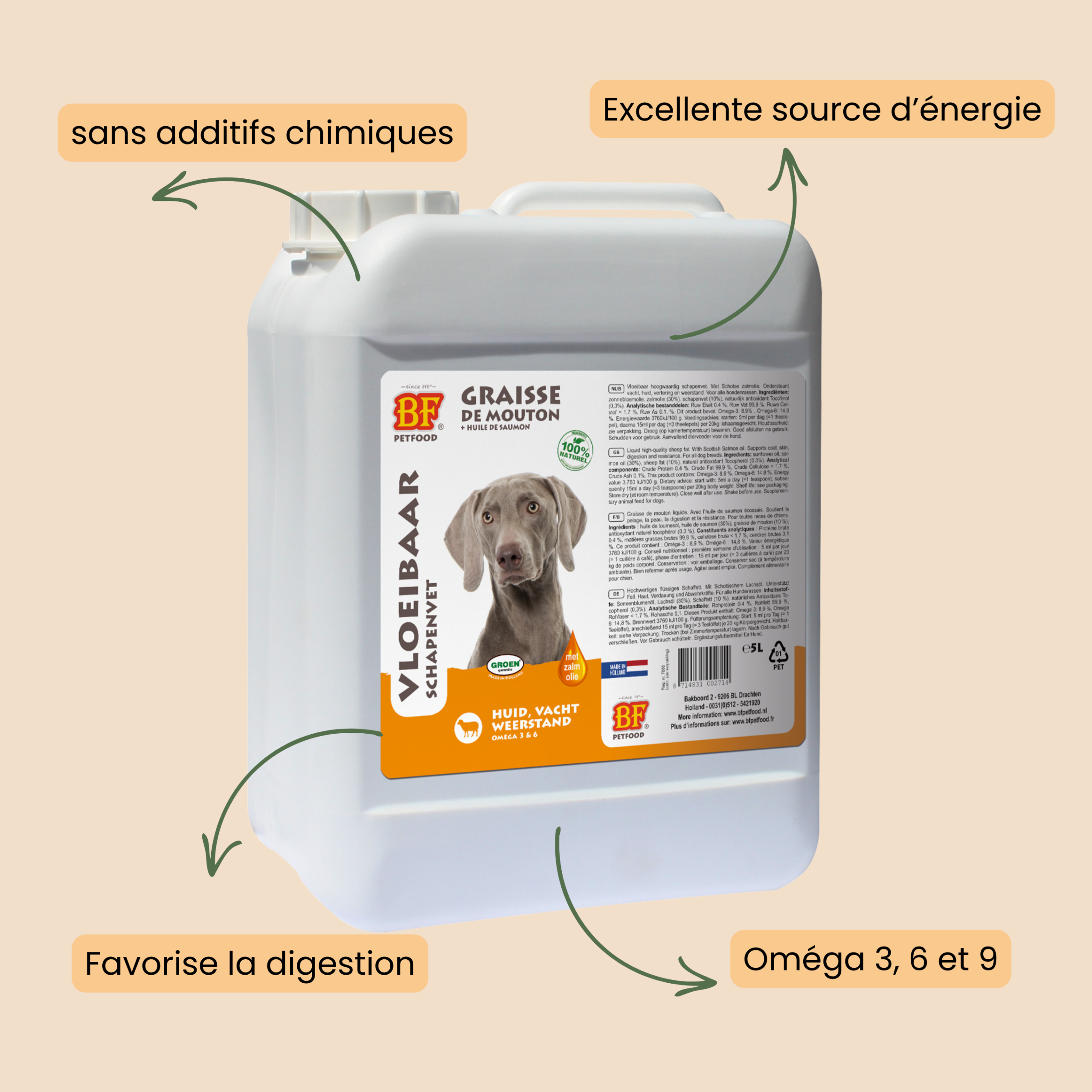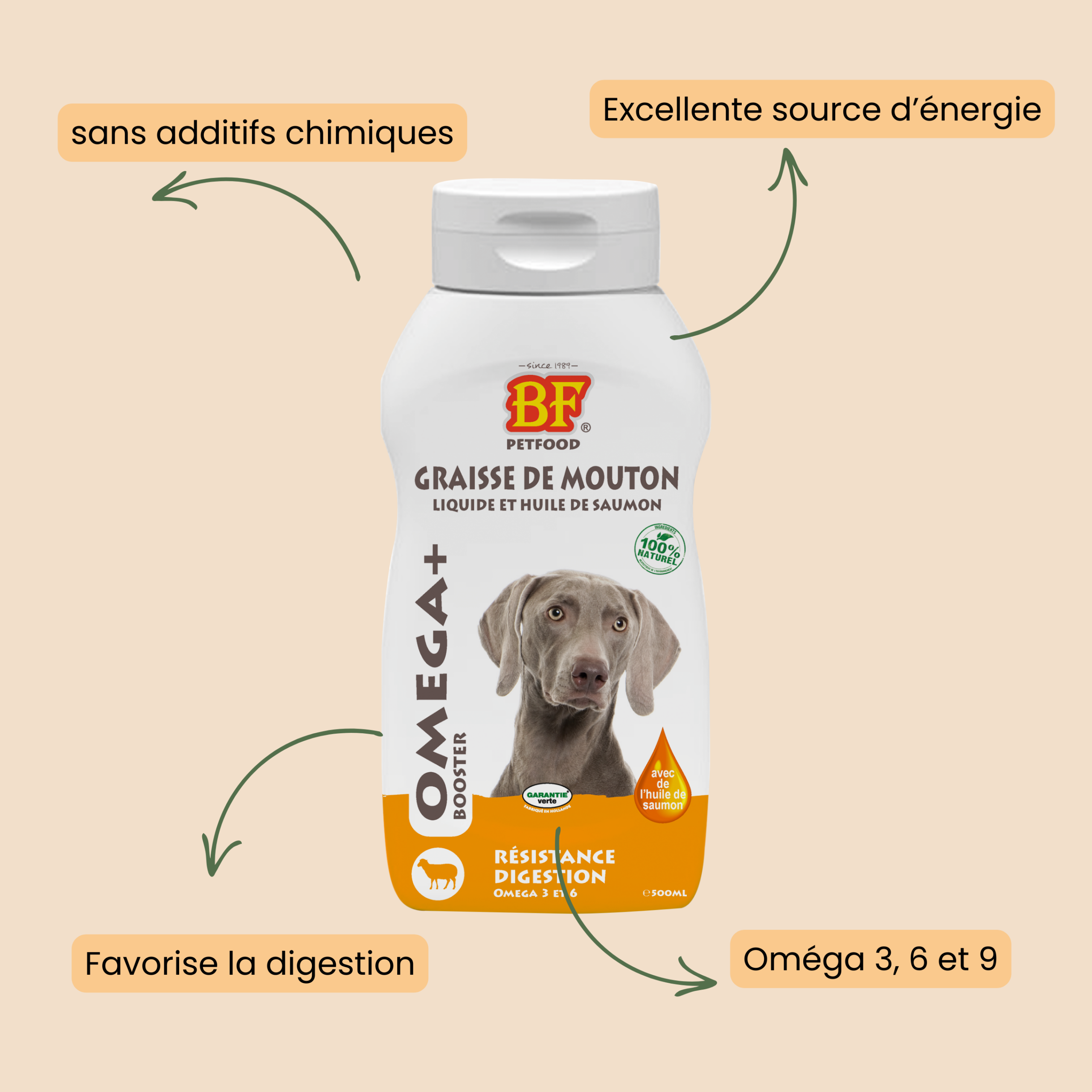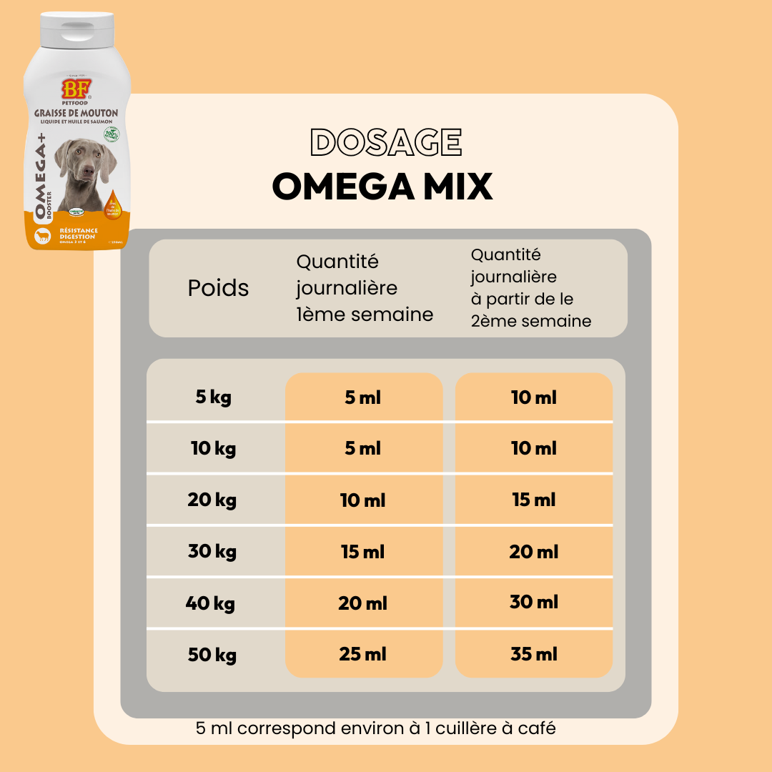 Aide à la digestion : En plus de favoriser une prise alimentaire plus importante, Omega Mix participe à une digestion plus facile. La graisse de mouton liquide et les huiles sélectionnées agissent en synergie pour protéger les intestins, et soutenir la flore intestinale, permettant ainsi à votre chien d'absorber plus efficacement les nutriments essentiels.