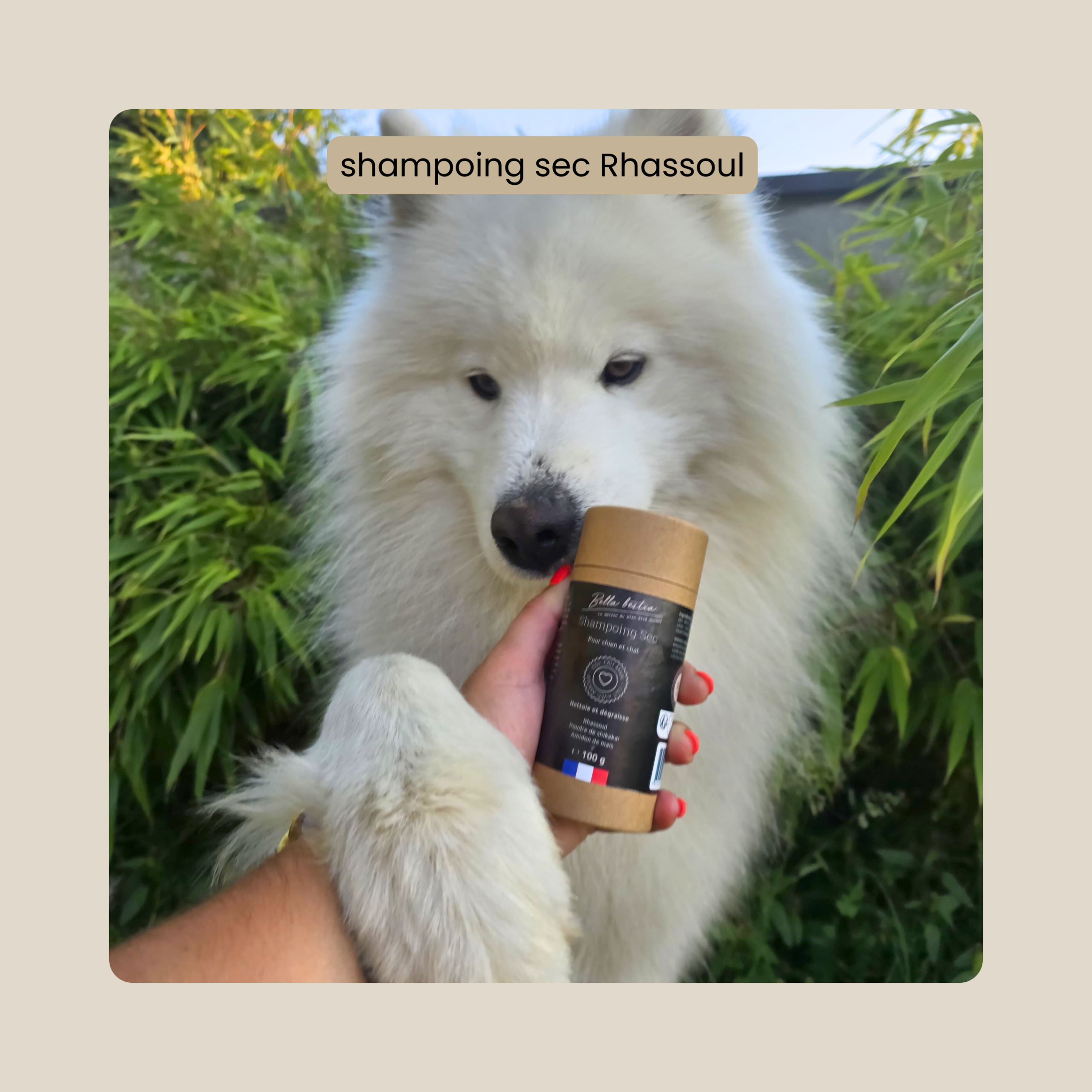 Le shampoing sec est formulé à base de rhassoul, une variété d’argile originaire du Maroc. Le rhassoul, surnommé “terre qui lave” possède des propriétés d’absorption exceptionnelles, il est traditionnellement utilisé dans le soin des peaux grasses. Contrairement au savon, le rhassoul ne possède pas de tensioactif. Ce qui en fait un ingrédient très doux pour la peau. Ce shampoing sec pour chien sans odeur ne dérangera pas votre loulou. Il ne se roulera donc pas dans une odeur forte à la première occasion.