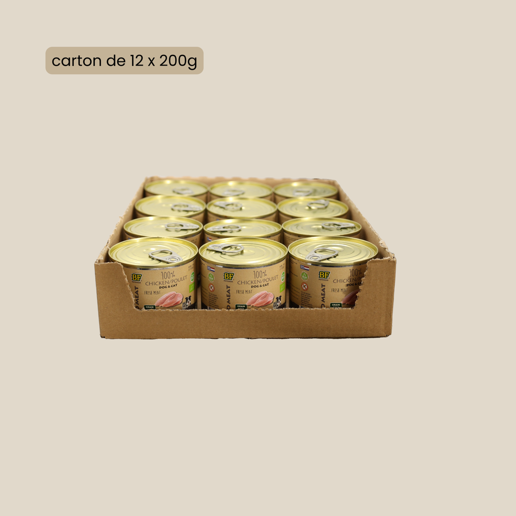 BF Petfood est une marque attentive au bien-être animal. La viande de poulet biologique utilisée pour le 100% poulet est produite sans expérimentation animale, et certifiée biologique, ce qui assure le respect des animaux d'élevage et l’absence d’antibiotique et d’OGM.